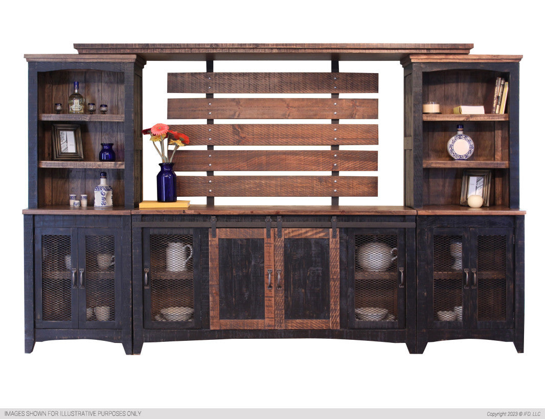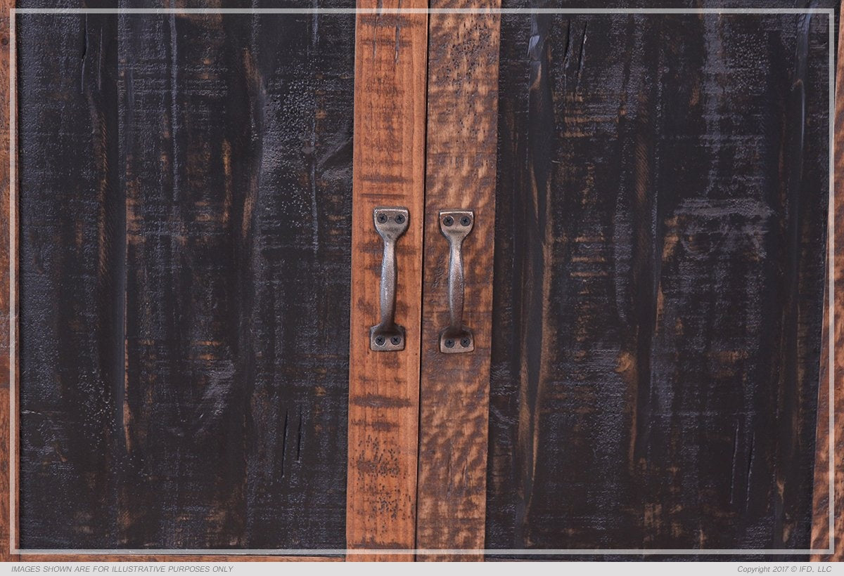 | Featured-2 | · 100% solid pine, great durability and value.· Two tone, multi-step lacquer finish. Weathered black finish on hand- distressed wood.· Mortise and tenon construction ensures stability and durability on all pieces.· Solid wood floated tops allow for wood’s natural movement.· Non-chip, custom pulls are durable and unique· Barn doors with gliding mechanism adds authentic rustic charm.· TV Stand features wire management on back panel.· Piers are universal and may be used by themselves. Fixed shelves on piers.· Slats between bridge and stand ship with Bridge· TV stand is 67-3/4” wide, may be used by itself.· Doors feature iron mesh on panels. | |