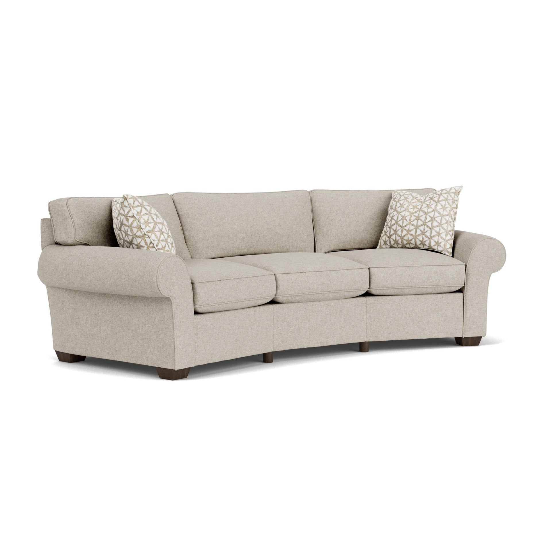 A classic look made for lounging With oversized rolled arms, deep seating, and generous proportions, Vail has everything you need for curled-up coziness. Its slightly flared arms and tall, padded front rail paired with plush cushions trimmed in welt cording make this style ideal for any lounging environment. Measure carefully to ensure this sofa will fit into your home. Door openings must be a minimum of 36 inches wide, and hallway turns are not possible. Model Number: 7305-323 Dimensions 34H x 107W x 51L