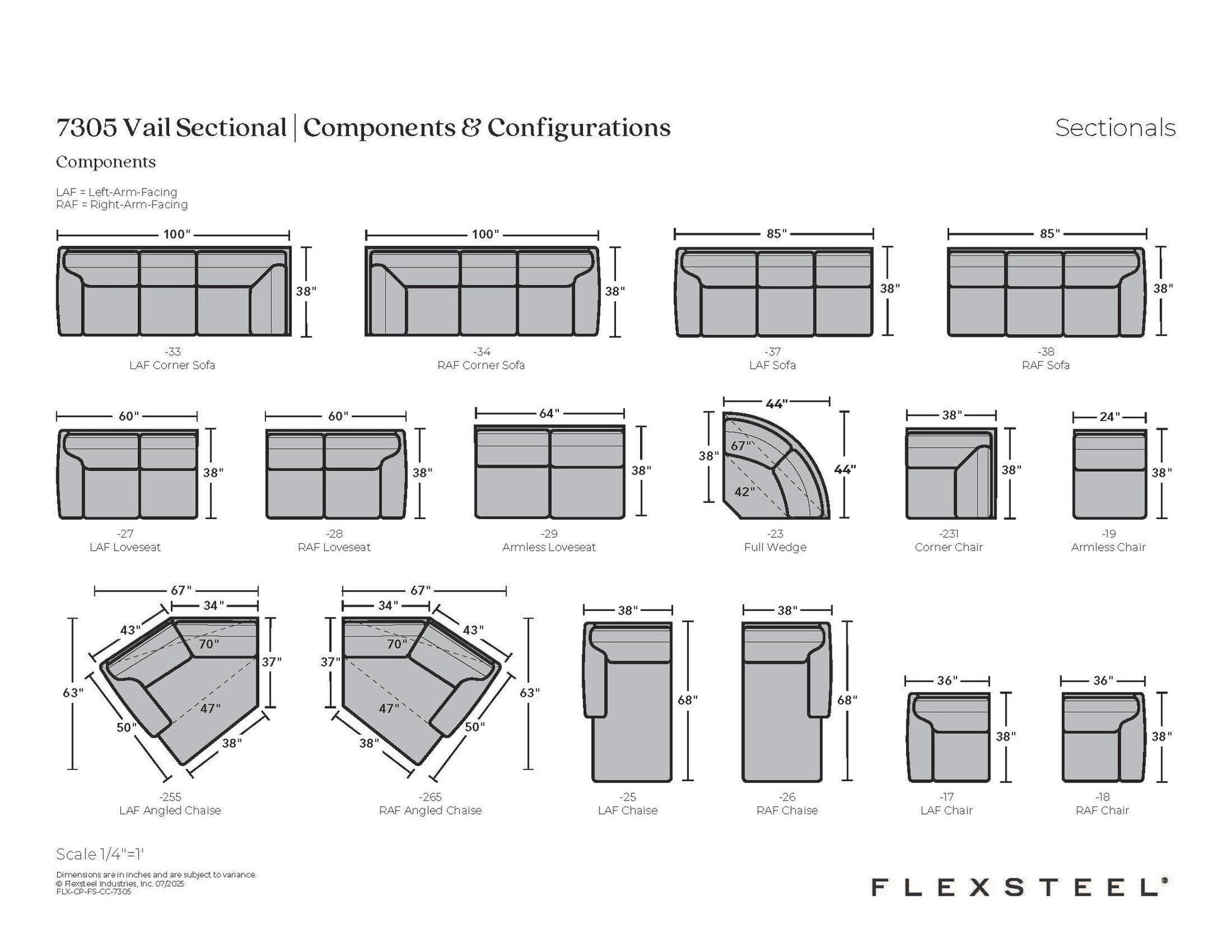 A classic look made for lounging With oversized rolled arms, deep seating, and generous proportions, Vail has everything you need for curled-up coziness. Its slightly flared arms and tall, padded front rail paired with plush cushions trimmed in welt cording make this style ideal for any lounging environment. Create endless seating setups with multiple sectional components, and gather around with family and friends for a relaxing get-together. Model Number: 7305-SECT Dimensions