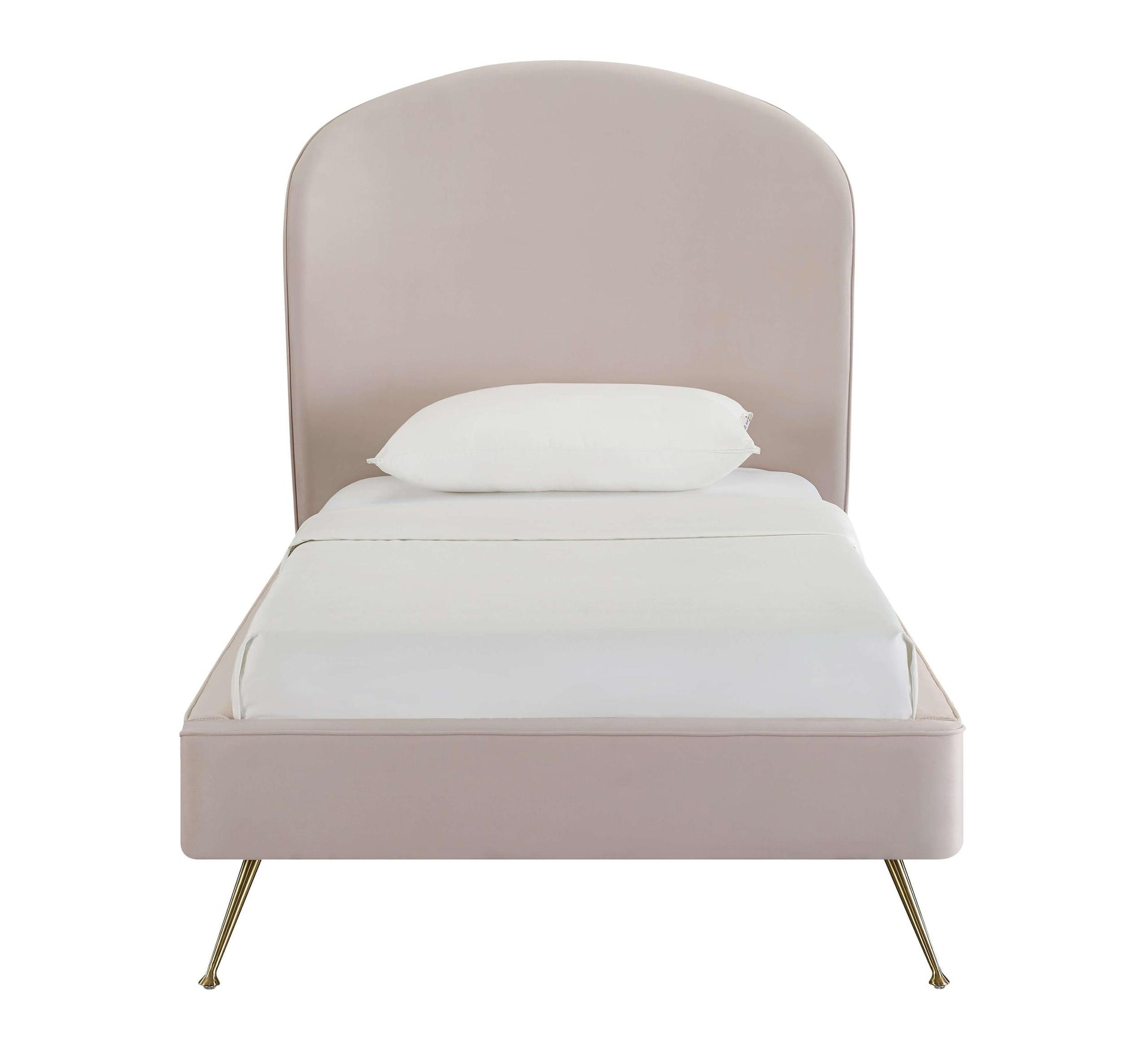 Modern glam is beautifully epitomized in the elegant curves of the Vivi bed. Boasting a dramatic silhouette and gold glamorous legs that pop against the textured velvet upholstery, it demands attention. Available in Twin, Queen and King sizes and multiple color options.