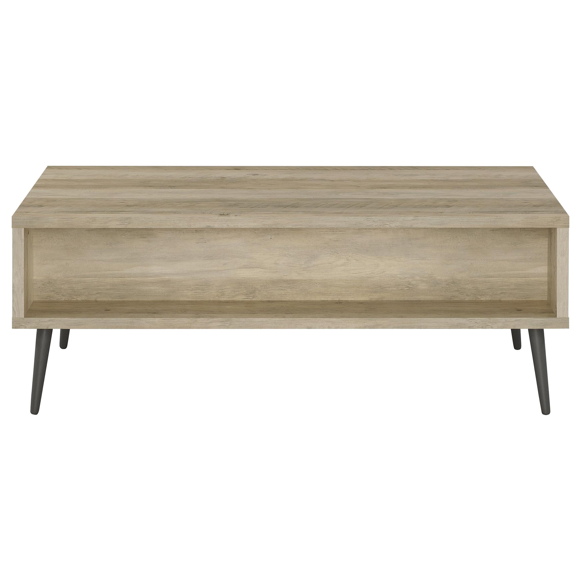 • Rectangular coffee table features a deep gray drawer front and open compartment