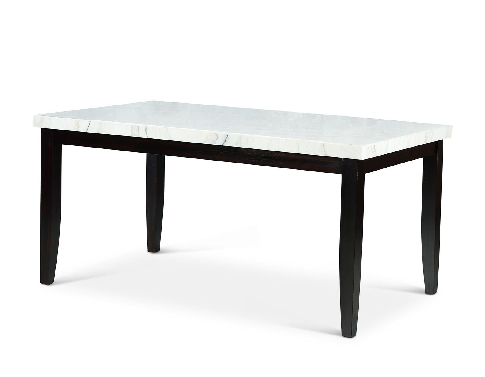 The Westby Marble top Dining Set brings the epitome of sophistication into your dining area, . Crafted with meticulous detail, it features a lustrous white marble table complemented by nailhead-trimmed ebony vegan leather chairs that are as comfortable as they are beautiful. The deep ebony finish on birch veneers and poplar solids, paired with tapered legs, adds to its elegance. Seating six comfortably, the 64-inch table is perfect for gatherings. Easy maintenance is assured with resilient materials. Elevate your dining area with this exquisite set, which includes the 64-inch table, bench and four chairs.
