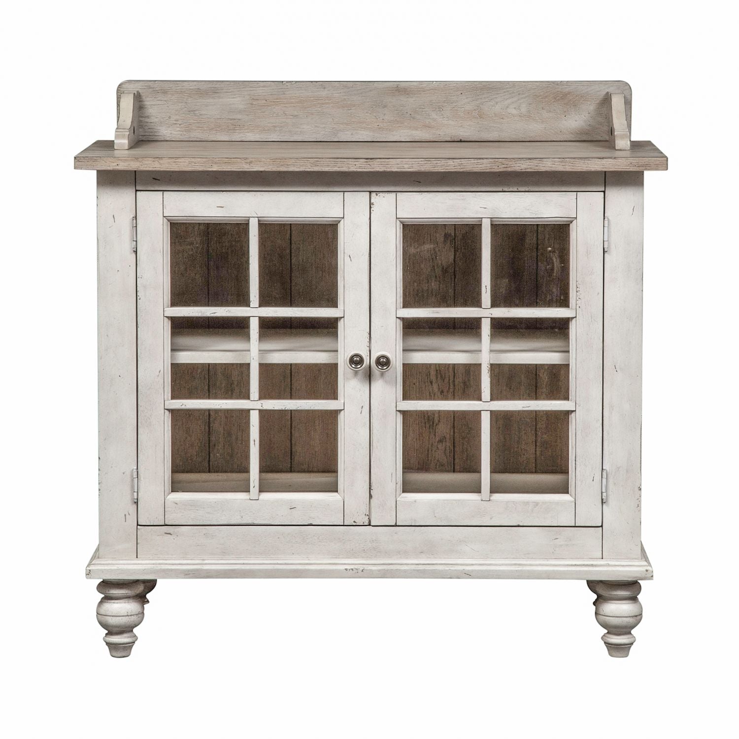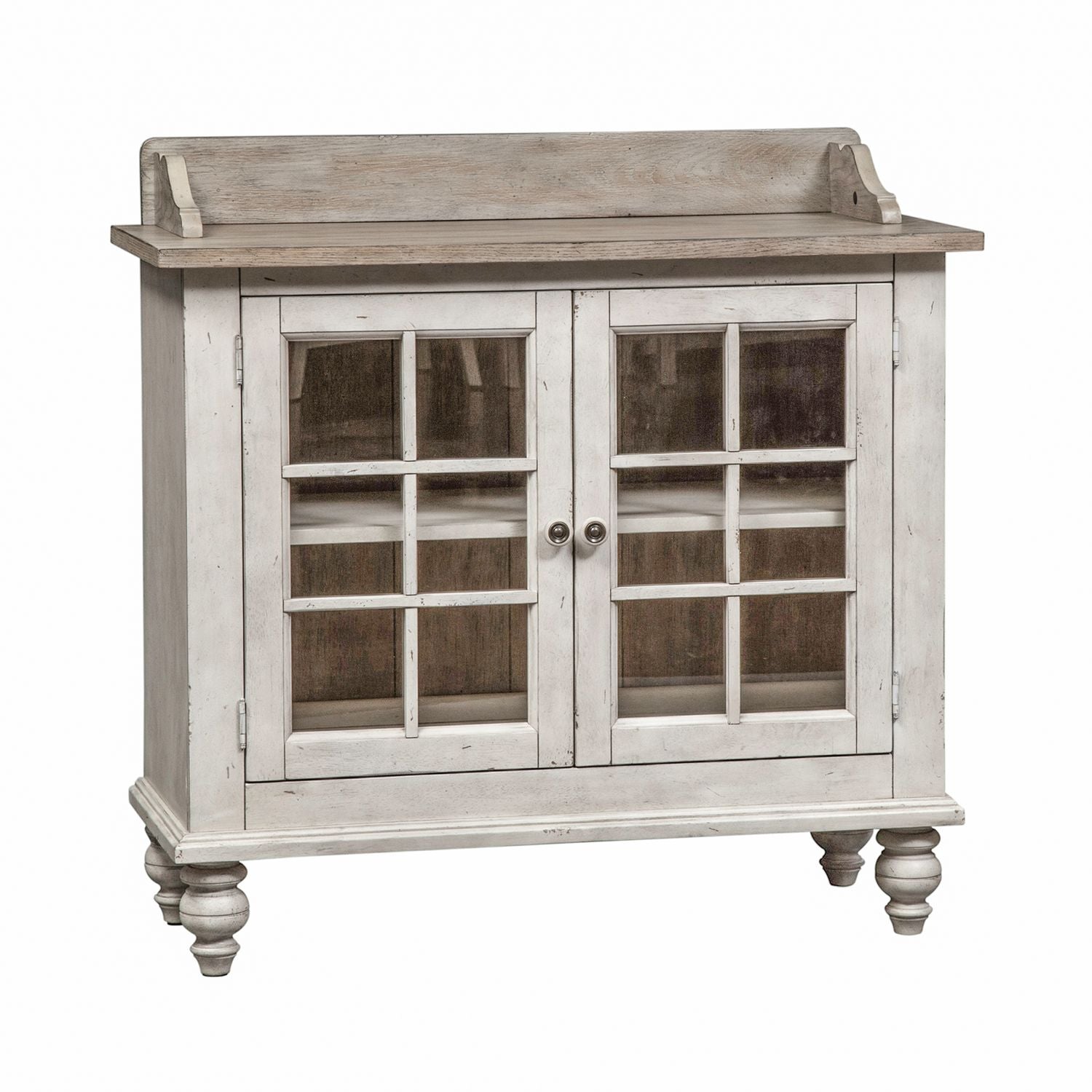 Invite an English country charm into your space with the Whitney server. Crafted of rubberwood solids and oak veneers, this piece features two wood framed glass doors with wood mullion accents, planked back panel in a weathered gray finish, a gallery top, one adjustable shelf, wood knob hardware with metal inserts, and is anchored by turned bun feet. The antique linen and weathered gray finish gives this group an heirloom appeal.