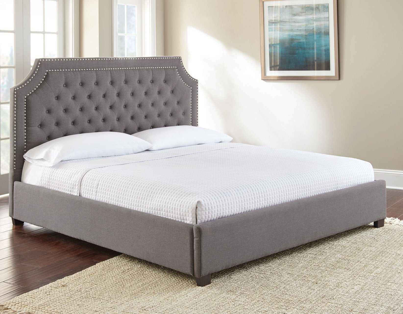 Wilshire offers transitional styling in a bed as stylish as it is comfortable. This upholstered bed features a button tufted headboard with rounded inset corners. The headboard is a lower profile and provides a great accent for transitional or traditional bedroom decors. Great support is provided by the 39 piece slat system and the bed is available in King or Queen sizes.
