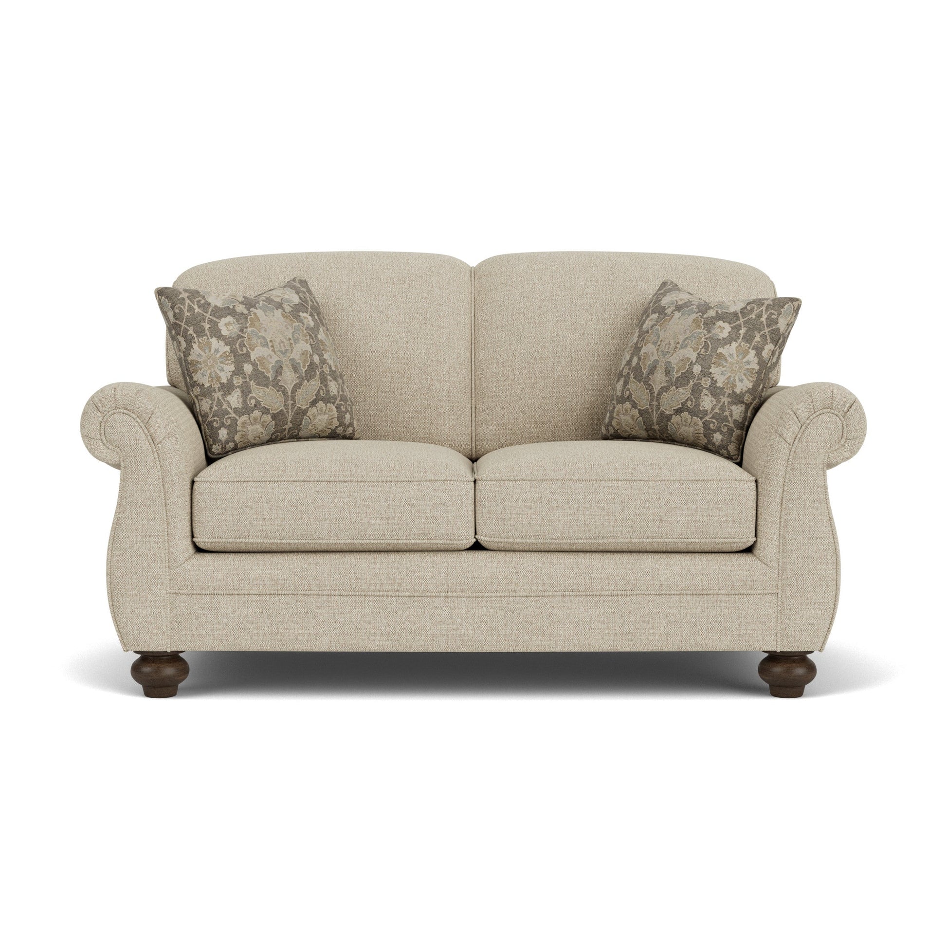 Clean lines trace graceful curves A tightly padded back, bun feet, and lyre-shaped rolled arms create an elegant scalloped profile for deep, cushioned seating. Enjoy the old-world refinement of Winston's traditional styling with all the benefits of brand-new upholstery. Careful tailoring of all fabrics reflects matching of all elements except outside back panels and welts. Model Number: 5997-20 Dimensions 38H x 67W x 38L