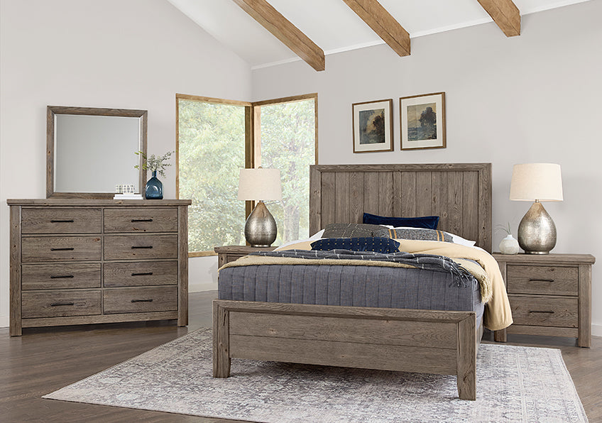 | Featured-1 | Vaughan Bassett has developed a patent-pending process that allows them to accelerate how wood ages. We have kept the splits; knots; cracks; and the bold grain pattern found in Oak lumber to create this reclaimed look in this beautiful and unique bedroom | |